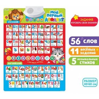 Обучающий плакат «Русский и английский алфавит» поможет ребёнку запомнить буквы, цифры и цвета сразу на двух языках. В режиме «Викторина» ребёнок проверит полученные знания и ответит на вопросы плаката.