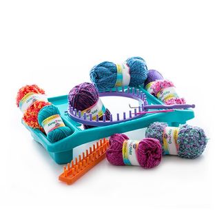 С большим набором для вязания Cra-Z-Knitz (Крейзи Нитс) создавать красивые, стильные теплые аксессуары из пряжи станет намного проще и веселей! Вязка изделий на специальных станках (лумах) значительно легче, чем вязание крючком или на спицах. Такой вид творчества как вязание чрезвычайно полезен для развития мелкой моторики, усидчивости и чувства вкуса юной леди. А приятным бонусом такого рукоделия станут уникальные авторские изделия, которые согреют в холодную погоду и добавит к образу модницы яркий штрих.В наборе Вы найдете все необходимое для вязки шапки, шарфа, митенок и гетр – два вида станков, 8 видов пряжи, удобная подставка для фиксации вязального станка и понятная пошаговая инструкция. Вы можете четко следовать схемам вязания, либо проявить фантазию и поэкспериментировать! Установка для вязания, входящая в комплект набора, позволит прочно зафиксировать станок, освободив руки. Кроме того, подставка оснащена углублениями, в которых удобно хранить пряжу, крючок, инструкции и другие материалы.Помимо изделий, процесс создания которых описан в инструкции, на прямоугольном станке, входящем в комплект набора, можно связать чехол для телефона или планшета, элементы для лоскутного одеяла и многие другие полезные и красивые вещицы, какие Вам только подскажет Ваше воображение.Изделия из пряжи, входящей в набор, допустимо стирать в машинке в режиме деликатной стирки в холодной воде.Набор упакован в красочную коробку-дисплей с прозрачным окошком, через которое можно посмотреть какая пряжа входит в набор. Игрушка рекомендована деткам от 8 лет и старше.В комплект набора входит:1 круглый станок для вязания – лум;1 длинный станок для вязания – лум;Установка для вязания;Набор наклеек;-1 моток фасонной пряжи фиолетового цвета (91,4 м., 42 гр.);-1 моток фасонной пряжи голубого цвета (68,6 м., 32 гр.);-1 моток фасонной пряжи фиолетово-розового цвета (164,6 м., 75 гр.);-1 моток фасонной пряжи фиолетово-голубого цвета (137,2 м., 90 гр.);-1 моток фасонной пряжи фиолетово-красного цв