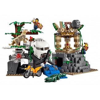Самый большой набор из новинок августа 2017 года LEGO City, посвященных исследователям джунглей – конструктор LEGO City 60161 База исследователей джунглей, состоящий из 813 деталей и включающий целых 8 минифигурок. Из деталей конструктора нам предстоит собрать три наземных транспортных средства исследователей, вертолет, хищное растение, заброшенный храм и фрагмент самолета, застрявшего в кроне огромного тропического дерева.Начнем с наземных транспортных средств. Все они выполнены в светло-оранжевом цвете. Из деталей набора вы сможете собрать шестиколесный вездеход, в котором можно перевозить инструменты. Второе транспортное средство – это тяжелый грузовик. Крыша его кузова снимается, сверху можно приторочить каяк для путешествия по тропическим рекам. Кроме того, на крыше оборудован подвижный манипулятор с крюком. К задней части кузова можно прикрепить легкий двухколесный мотоцикл – и это третий транспорт, который мы можем собрать из деталей конструктора.Вертолет исследователей джунглей оборудован баками для посадки на водную поверхность, лопасти вращаются, сбоку на корпусе имеется функциональная лебедка с крюком, с помощью которой можно подцеплять и перемещать различные грузы.Хищное тропическое растение имеет захлопывающиеся на подобие капкана створки, внутрь можно поместить фигурку паука или лягушку.Переходим к основной постройке набора – здесь предусмотрено огромное количество интересных игровых возможностей и функционала. Она состоит из двух частей, разделенных небольшой речушкой с водопадом. Правая часть – это заброшенный храм. На вершину сооружения можно забраться по лиане, однако здесь таится ловушка в виде камня, падающего на исследователей. Под камнем скрывается люк, через который можно проникнуть внутрь храма. Еще один тайник находится в каменном основании храма, где речушка берет свои истоки.Левая часть – это большое тропическое дерево, в ветвях которого застрял потерпевший крушение самолет. В основании конструкции подвешена подвижная паутина, кабина самол