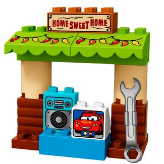 Замечательная новинка для малышей – набор конструктора LEGO DUPLO, вышедший в июне 2017 года и созданный по мотивам ожидаемого полнометражного мультфильма «Тачки-3» (англ. Cars-3). Как и все наборы серии Дупло, конструктор не отличается сложностью сборки, состоит из деталей крупного размера со скругленными углами, которые удобно держать в маленьких детских ручках. Такой набор познакомит ребенка с основами конструирования, разовьет ловкость пальчиков и разбудит фантазию.Набор состоит из 23 деталей, из которых собирается небольшой фрагмент домика и машинка.Один из любимых малышами героев мультфильма – грузовой автомобильчик Мэтр у себя дома, где он может как следует отдохнуть после тяжелого трудового дня. Здесь он может послушать музыку из большой колонки или поболтать со своим лучшим другом Молнией МакКуином по видеосвязи. Дом Мэтра, одновременно являющийся, конечно, и гаражом имеет яркую зеленую крышу, украшенную разноцветной гирляндой и вывеской с милой и доброй надписью: «Дом, милый дом». В комплекте вы также найдёте все аксессуары, которые так нужны каждому настоящему автомобилю: гаечный ключ, канистру для топлива и дорожные конусы.В набор из 23 деталей входит:-Машинка Мэтр;-Домик-гараж;-Дополнительные игровые аксессуары.Особенности и игровой функционал:-Подвижный манипулятор с крюком на машинке. None
