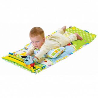 Переносной развивающий коврик для игры на животе, комплектуется самодвижущийся музыкальной машинкой, которая функционирует от 3-х батареек «ААА» (в комплект не входят). На машинке могут закрепляться 2 съёмные мягкие игрушки «Коровка» и «Собачка», которые входят в набор вместе с ковриком. Также в комплект входит универсальная подушка. У машинки есть функция отключения звука. Коврик способствует тренировке мышц рук, ног и спины, подготавливая ребенка к первому шагу, помимо этого он помогает развивать навыки слухового, зрительного и осязательного восприятия. Коврик обладает компактными размерами и удобен для транспортировки. None