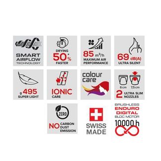Мощность 2400 Вт Бесщеточный двигатель с электронным управлением Enduro BLDC Ионный генератор Технология Smart Airflow Супергибкий сетевой шнур 3 м с системой Rotocord Волнистый нагревательный элемент Thermo-Control 6 комбинаций скорости и температуры воздушного потока Кнопка мгновенной подачи холодного воздуха Instant Cold Съемный металлический фильтр 2 профессиональных ультраузких концентратора: ненагревающаяся насадка Touch Me (7,5 см), стандартная насадка (6 см) Вес без шнура 495 г Цвет
