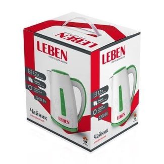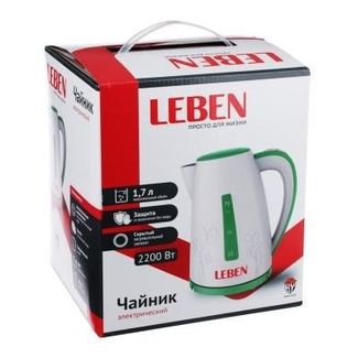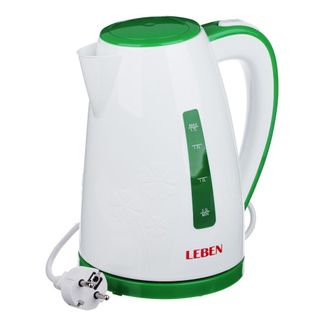 - LEBEN Чайник электрический 1,7л, 2200Вт, пластик, белый с зеленым, с рисунком белый с зеленым по выгодной цене 1 890 р. руб.;