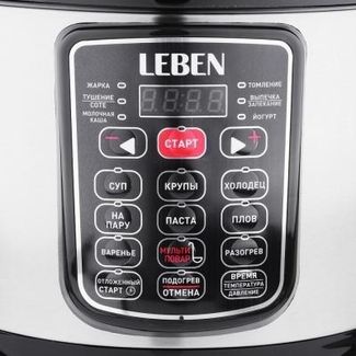 Электрическая мультиварка Leben – бюджетная модель, имеющая массу положительных отзывов. Страна производитель – КНР. Имеет серебристый корпус и чашу ёмкостью 5 л. Вес модели чуть больше 4 кг. Мультиварка оснащена 16 режимами приготовления пищи, в том числе с её помощью можно делать каши, варенье, холодец, пасту, готовить на пару. Есть и режим мультиповар. Дополнительно вы можете определить время, температуру и давление, включить или выключить подогрев.