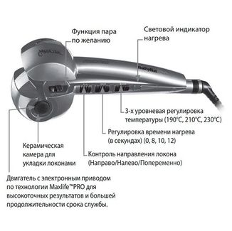 Плойка с использованием пара BaByliss PRO BAB2665SE позволяет осуществлять завивку волос почти без усилий. Это революционный путь создавать кудри. Прибор автоматически формирует локоны один за другим. Последовательно, легко! Создавайте идеально гладкие и блестящие локоны всего за несколько секунд. Нет ничего сложного – выберите, температуру, направление и время завивки, при желании включите функцию пара, затем поместите прядь волос в керамическую камеру, в которой за 8-12 секунд сформируется завиток. Закройте щипцы и ждите звукового сигнала, который оповестит о "готовности" локона. При этом с помощью опций переключателя можно задать направление завивки. Прибор значительно облегчает создание волнистых укладок и в 2-3 раза экономит время на их создание. Функция пара позволяет сделать более блестящие, увлажненные и гладкие локоны. Вода заливается в соответствующий резервуар. Если вы хотите использовать прибор без данного режима, просто отключите его. Керамическое покрытие внутреннего цилиндра абсолютно безопасно для волос и стойкое к механическим повреждениям. Мгновенный и равномерный нагрев по всей поверхности, что позволяет получать качественную и стойкую завивку. Температура щипцов восстанавливается за считанные секунды. Есть три температурных режима - 190° C - 210°C - 230° C, выбирайте нужную в зависимости от желаемого результата. Плойка удобная - эргономичная ручка позволяет надежно держать прибор в руке. Практичная - даже при случайном падении со стола корпус останется целым. Если прибором не пользовались в течение 20 минут, он перейдет в режим ожидания. Температура в данном случае понизится до 150°C. Автоматическое отключение плойки произойдет через 60 минут. Вращающийся шнур во время работы не запутается и не перегнется. А его длина 2,7 м позволяет комфортно работать на большом расстоянии от розетки. В комплекте предусмотрен дополнительный резервуар для воды. А также есть специальное приспособление для очистки камеры прибора Особенности автоматической плойки B