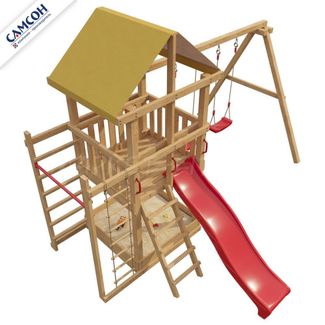 Внимание! Конструкция запатентована. В комплект входит лекало/трафарет для самостоятельного формирования отверстий. Детская игровая деревянная площадка для дач и частных домовладений предназначена для детей от 4 до 9 лет, создает условия, обеспечивающие физическое развитие ребенка, развивающие координацию движений, преодоление страха высоты, ловкость и смелость, чувство коллективизма в массовых играх. Материал: Каркас изделия изготовлен из клеёного бруса сосны, ограждение и иные элементы из массива сосны. Покрытие: Без покрытия, все детали шлифованы, радиус закругления торцов деталей 5мм. Комплектация: яркая натяжная крыша из ткани; шведская стенка; веревочная лестница; турник; качели лодочка (2 шт.); лестница деревянная; песочница с высокими бортами; пластиковые поручни, длина 250мм (4шт.); яркая пластиковая горка (4 цвета: зеленый, красный, желтый, синий. Цвет горки комплектуется из имеющихся на складе. Производство Бельгия). Габариты площадки: внешние размеры домика 4,6м х 3,7м; высота 3,2м; длина горки 2,5м. Общий вес площадки: 170кг (+/- 5кг) Описание: Товар поставляется в разобранном виде. В комплект для самостоятельной сборки входит подробная инструкция по сборке товара. Товар упакован в гофрокартонные короба в количестве: 8 мест + горка. Установка детской игровой площадки проводится на ровной поверхности, свободной от насаждений. Размер площадки не менее 5,3м х 3,1м. Рекомендуем зафиксировать конструкцию используя анкера любой формы. Обращаем Ваше внимание на то, что Изделие изготовлено из натуральной древесины хвойных пород