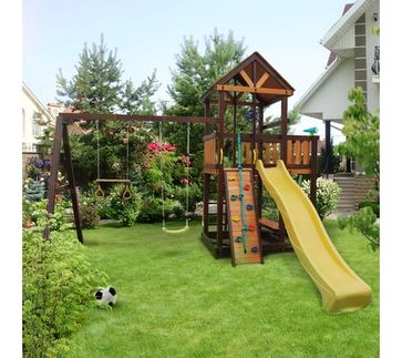 Крепление: устанавливается на ровную поверхность Высота: 3,40 м Занимаемая площадь: 4,37 х 4,20 м Скат горки: 2,90 м Высота горки: 1,45 м Материал: многослойный брус хвойных пород, покрытие Aquaris ЛКМ Renner производство Италия Допустимая нагрузка: 250 кг Масса изделия: 256 кг Комплектация: Игровая веранда, крыша деревянная, лестница, песочница, скалодром, скат,поручни металлические,ручка пластиковая - 2 шт, кольца с перекладиной, качели пластиковые, канат, штурвал, телескоп None Есть доставка.