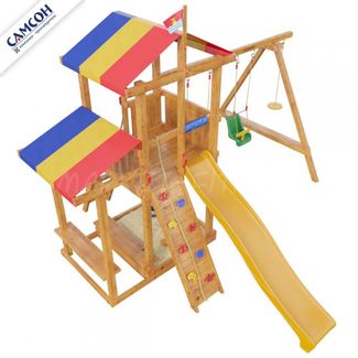 Горка, песочница, качели для детей разных возрастов, лестница с металлическими ступенями и поручнями позволят тренировать мышцы рук и ног, вестибулярный аппарат, цепкость и ловкость. А двускатная яркая натяжная крыша из тентовой ткани надежно защитит покорителей крепости от дождя. None Есть доставка.
