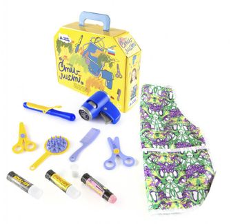 Набор "Стилист" создан для юных модниц. Он упакован в большую картонную коробку ярко-желтого цвета. В него входят фартук, ножницы, расческа и щетка, плойка и краски для макияжа. С помощью этого набора маленькие стилисты научатся делать модные прически и наносить макияж. None