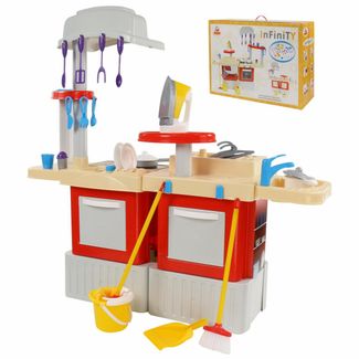 Большой игровой комплекс для девочек, заключающий в себе кухню и набор для уборки, стирки и глажки. None