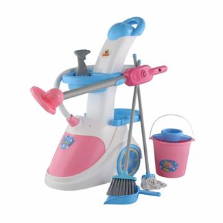 Пылесос помощницы озвученный, он будет издавать звук, если нажать и держать кнопку на рукоятке пылесоса. В наборе на тележке ведерко с отжимом, швабра, щетка и совок. None
