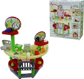 Игровой комплекс представляет собой витрину магазина с ячейками и полками, где можно выложить для продажи фрукты, овощи и другие продукты. None