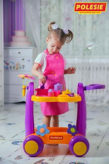 Сервировочный столик представляет собой тележку на колесиках. В комплект входит посуда: