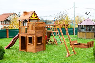 • Это идеальная детская площадка для большой семьи.• Башня, домик, рукоход, песочница, столик для игр, скалодром, капитанский мостик, 3 качельных места и многое другое. • Площадка подходит для 7 детей! • СБОРКА - 10000 РУБ. None Есть доставка.