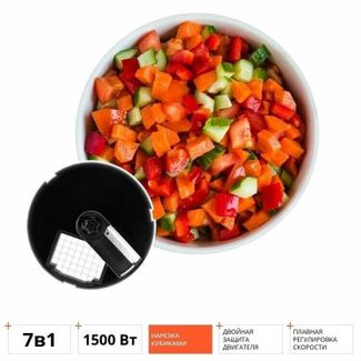 Многофункциональный блендер RHB-CB2978 «7 в 1» можно с уверенностью назвать облегченной версией кухонного комбайна. Этот компактный и мощный прибор поможет вам буквально за пару минут приготовить тесто для блинчиков, взбить сливки для десерта, измельчить, нашинковать или нарезать кубиками любые продукты, будь то сырые или отварные овощи, мясо, орехи, зелень. Цвет черный. Тип управления электромеханический. Максимальная мощность 1500 Вт Материал корпуса металл / пластик. Скорость работы в основном режиме 10200 - 13500 об/мин. Скорость работы в турборежиме 16500 об/мин. Плавная регулировка скорости. Чаша измельчителя большая/малая. Объем чаши измельчителя 2000 мл/500 мл. Объем мерного стакана 600 мл. Насадка-терка. Насадка-шинковка. Насадка для нарезки кубиками. Насадка-блендер. Насадка-венчик. Габаритные размеры 66х407х66 мм. None Возможен самовывоз.