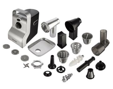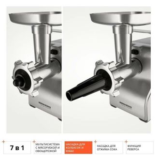 Современная мультисистема «7 в 1», которая выполняет функции соковыжималки, шинковки, мясорубки, подходит для изготовления кеббе и домашних колбасок. Многофункциональное устройство Redmond упрощает подготовку ингредиентов для первых, вторых блюд, десертов, закусок, а также напитков. Тип управления механический. Цвет черный / серебро. Максимальная мощность 2000 Вт. Материал корпуса пластик / металл. Материал лотка металл. Производительность 2,5 кг/мин. Насадки для кеббе и колбасок есть. Количество перфорированных дисков для фарша 3. Диаметр отверстий диска 4,8 мм/7 мм. Количество терок 3. Соковыжималка есть. Функция реверса есть. Габаритные размеры 350х326х165 мм. None Возможен самовывоз.