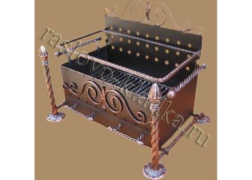 Кованый мангал для барбекю. С фасадной части мангал украшен стойками в виде свечек. Оснащен рамкой для гриля с возможностью установки на нескольких уровнях. Выполнен из листа толщиной 5 мм. None