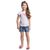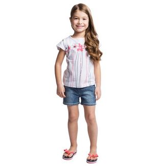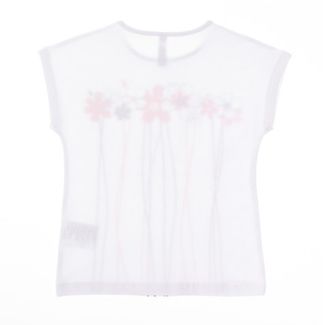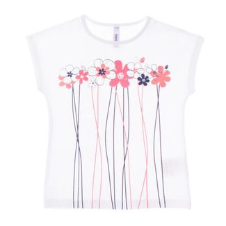 Мягкая хлопковая футболка с короткими рукавами. Украшена водным принтом с цветочками. Удобная конструкция со спущенным плечом без швов. None Можно купить без предварительного заказа.