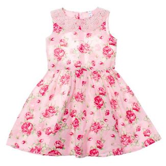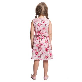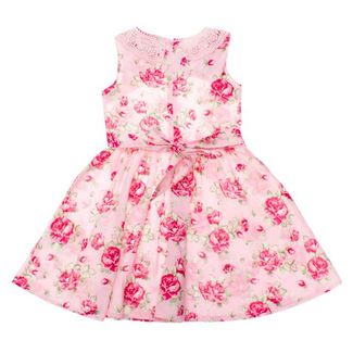 Женственное розовое платье с розочками из чистого хлопка. Кружевной воротник украшен жемчужными сердечками. Мягкое и легкое, без рукавов. Есть завязки на поясе. Застегивается на потайную молнию на пине. None Можно купить без предварительного заказа.
