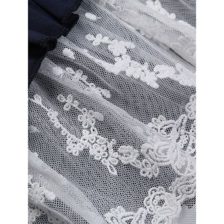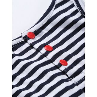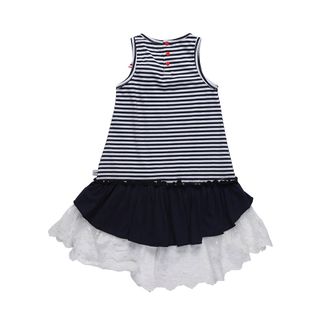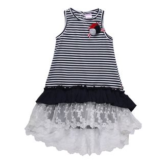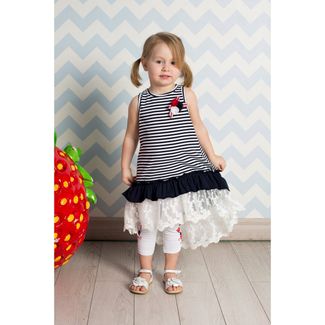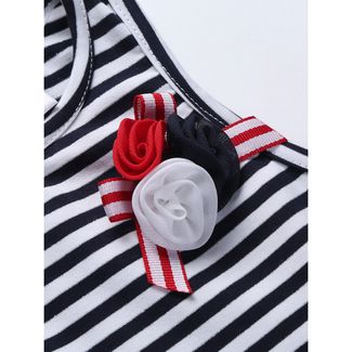 Летный сарафан из трикотажной ткани в полоску для девочки. Декорирован воланами из контрастной ткани и кружевом. Лиф украшен брошью из цветов. Сзади сарафан застегивается на кнопки. None Можно купить без предварительного заказа.