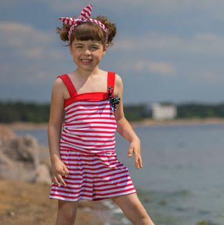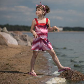 Летний комбинезон для девочки с шортами-юбкой. Модель выполнена из трикотажного хлопкового полотна, на поясе эластичная резинка, на груди чёрный бантик в белый горошек. Комбинезон идеально подойдёт для летней прогулки или похода на пляж. Модная полоска отлично гармонирует с яркими детскими сандалями или шлепанцами. В этой одежде девочка выглядит очень стильно и интересно. None Можно купить без предварительного заказа.