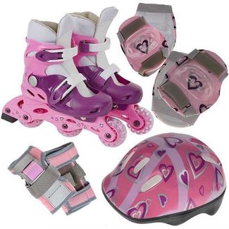 Ролики: шасси: пластик, подшипник: 608Z, колеса: поливинилхлорид (р.26-29 - 64мм, р.30-33 - 70мм, р.34-37 - 72мм), цвет - розовый/фиолетовый. Шлем: материал - пенополистирол с отверстиями для вентиляции головы; цвет - белый с малиновым принтом. Защита: для локтей, колен, запястий, принт на тканевых (нейлон) элементах. Предназначен для любительского катания. Минимальная сумма заказа 500 руб.