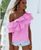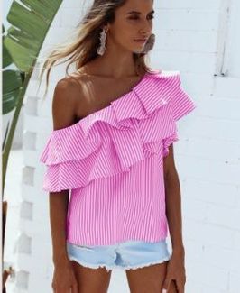 Стильная летняя кофточка в полоску идеально подойдет для летних прогулок. Изделие свободного кроя, асимметричного дизайна. Декорировано воланом по линии декольте. В наличии L 2 шт None Есть доставка.