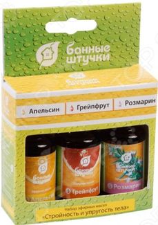 Набор эфирных масел Банные штучки Стройность и упругость тела включает в себя масла апельсина, грейпфрута и розмарина. Масла способствуют расслаблению, подтягивают и стимулируют кожу. Приятная консистенция, цвет и запах, плюс ко всему его полезные свойства, не оставят его незамеченным для вас. Такой набор идеально подойдёт для отдыха в бане. В комплекте три флакона по 15 мл. None Возможен самовывоз. Есть доставка.