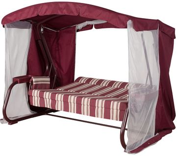Угол наклона спинки регулируется пошагово, при этом качели можно разложить полностью на 180 градусов, превратив ее в комфортную двуспальную кровать. Чехлы мягких элементов снабжены молнией и легко снимаются для стирки.