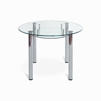 Обеденный стол с хромированными опорами и вместительной полкой.Опоры стола и подвесы полки надежно крепятся к столешнице стальными пятаками на уф склейке.Полку стола можно использовать для размещения на ней декоративных элементов.Подходит в современные интерьеры кухонь, кафе.Стекло и хром выглядят воздушно и легко, несмотря на массивность изделия, эти материалы очень гигиеничны. Работаем круглосуточно!Возврат 21 день. Страна производства: Россия Есть доставка.