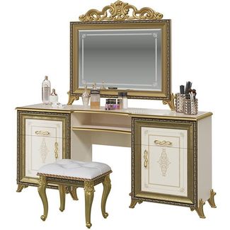 Стол туалетный с зеркалом с короной и пуф Версаль. Артикулы набора - СВ-07 + СВ-08К + СВ-09. Цвет - слоновая кость. Размер (ШхГхВ) 167х43х179 см. + 47х36х51 см. Элитный туалетный ансамбль для Любимой привлекает комфортом и поражает великолепием! Корона № 2 в комплекте. None Есть доставка.