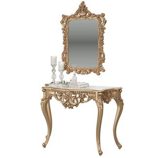 Туалетный столик с зеркалом ЗК-01. Артикулы набора мебели КН-01 + ЗК-01. Цвет - золото. Размер (ШхГхВ) консоли 122х48х82, зеркала - 70х8х106 см. Дизайн комплекта впечатляет очарованием и богатством - мебель в дворцовом стиле украшена изящным резным орнаментом с нотками барокко. С ним всё будет красивее - и дом, и его Хозяйка! None Есть доставка.