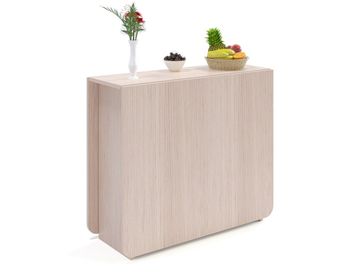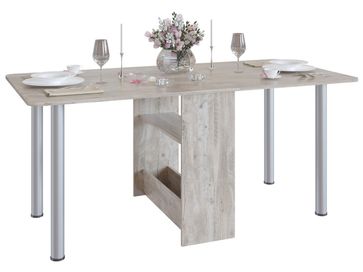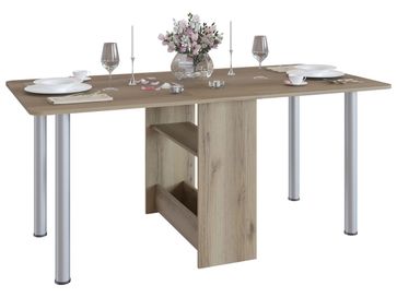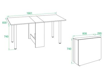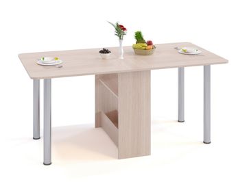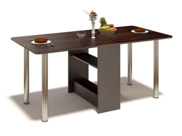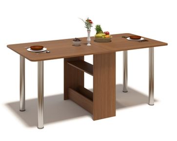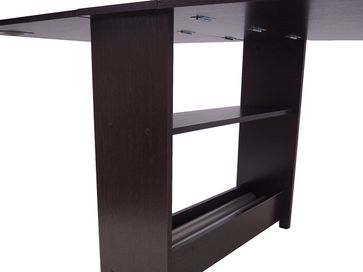 Стол-книжка на металлических опорах. Когда стол сложен, опоры хранятся внутри, в предусмотренном для этого ящике. Очень удобно, что не надо хранить их отдельно. Ширина стола в сложенном состоянии всего 295 мм, тогда как в разложенном виде — 1661 мм.<br>