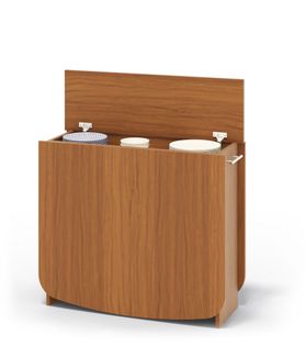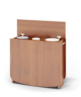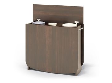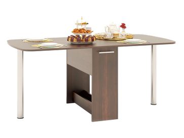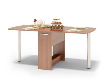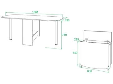 Стол-книжка на двух металлических ногах. В сложенном состоянии ширина стола всего 295 мм, тогда как в разложенном состоянии столешница увеличивается до 1661 мм. Под центральной столешницей находится отделение для хранения (столешница поднимается).