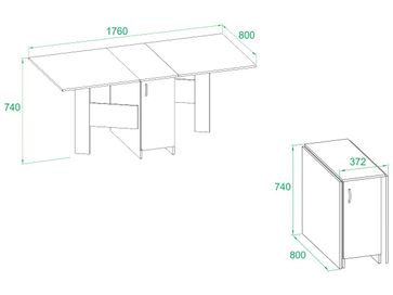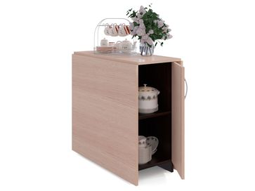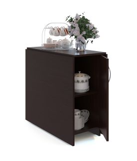 В сложенном состоянии стол превращается в тумбу с шириной всего 372 мм. Сбоку предусмотрен шкафчик с двумя отделениями, в котором будет удобно хранить посуду, салфетки и столовые приборы.<br>