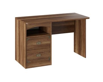 Прямой письменный стол Навигатор, выполненный в темном древесном оттенке. Стильный вариант для организации удобного рабочего уголка в детской или молодежной комнате. Стол оснащен тумбой с открытой полкой и двумя выдвижными ящиками. Фасады оформлены очаровательными металлическими уголками в морской тематике.<br>