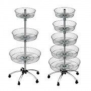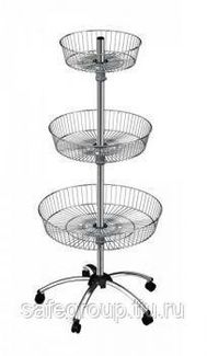 устойчивое основание из хромированной трубы; поставляется с 5-ю поворотными колесами со стопорным механизмом; на 5 колесах, 3 переставные корзины ( 450/580/710); H = 1650 мм , корзины и основание имеют хромированное покрытие; привлекательный внешний вид; быстрая легкая сборка без дополнительного инструмента. None