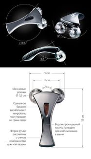 Солнечная батарея, расположенная на корпусе, вырабатывает микротоки, поступающие на грани сфер. Активирует клетки кожи, улучшая метаболизм и микроциркуляцию крови в подкожных тканях