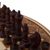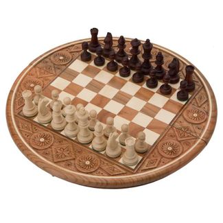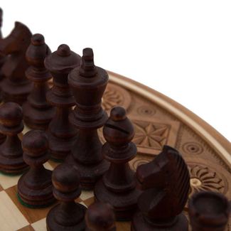Вы наверняка заметили, что это не классическая квадратная доска, к коим мы привыкли, а круглая. Это не оказывает никакого влияния на сам процесс, однако внешний вид становиться намного лучше. Поле, на котором происходит сражение, стандартное, с контрастными клетками, а вот вокруг него расположились многочисленные геометрические узоры. Это не просто рисунок, а резьба, выполненная опытными руками, поэтому она и получилась нас красивой. Кстати, как и полагается, тут всё изготовлено из прочной древесины.