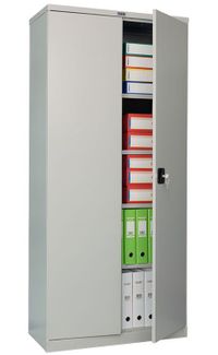 изделия сертифицированы на соответствие требованиям ГОСТ 16371-93; ригели из оцинкованной стали и пластиковые втулки обеспечивают бесшумный ход дверей и надежное запирание шкафа; комплектуются ключевыми замками с ручками (Burg GSC813); 5 уровней хранения (4 полки в комплекте); максимальная нагрузка на полку - 60 кг; поставляются в разобранном виде; цвет: серый полуматовый (RAL 7038); тип покрытия: порошковое вместимость: не менее 48 папок по 75 мм. None