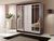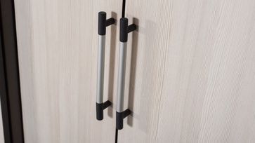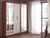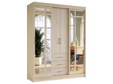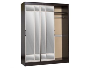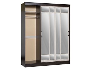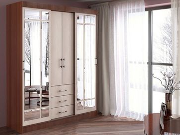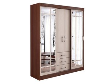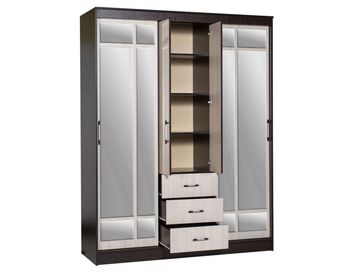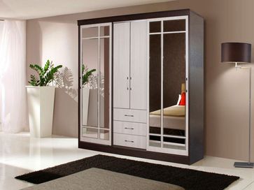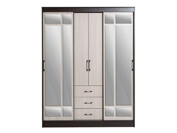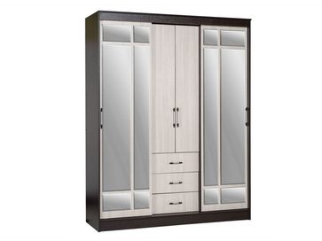 <br> Функциональное наполнение: два отделения со штангами для вешалок, полки и три выдвижных ящика, высокие зеркала.<br> Декоративный: фацетная обработка кромки зеркал, двухцветные ручки, контрастное сочетание фасадов и корпуса.<br> Вместительный: длинная стационарная штанга для вешалок.<br> Безопасный: зеркала с фацетной кромкой.<br> Функциональный: два платяных шкафа, полки, ящики, высокие зеркала.<br> Направляющие: СТ, сверху алюминий, снизу пластик.<br>