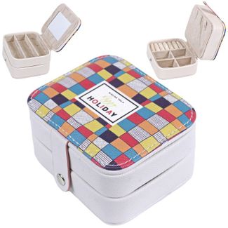 Шкатулка для украшений размером 11*9*6 см двухъярусная и выполнена из искусственной кожи. Нижнее отделение содержит пять отсеков для украшений, включая отсек с валиками для колец.  Там же расположены крючки для цепочек и браслетов. Верхнее отделение разделено на три отсека. Внутренняя сторона крышки оборудована зеркальцем. Внутренняя поверхность шкатулки оформлена светлым флоком, что придаёт ей шарм и изысканность.