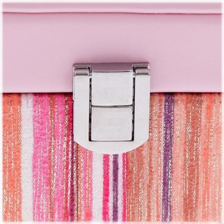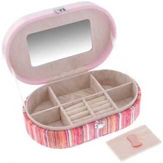 Шкатулка для украшений выполнена в виде чемоданчика 23*14*7 см из лаковой искусственной кожи с потрясающим дизайном. Шкатулка одноярусная, состоит из семи отсеков для разделения украшений по видам и коллекциям, включая два отсека с валиками для колец. Внутренняя сторона крышки оборудована зеркалом 13*7 см. Чемоданчик закрывается с помощью замка. Внутренняя поверхность шкатулки оформлена светлым флоком, что придаёт ей шарм и изысканность.