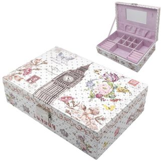 Шкатулка для украшений выполнена в виде чемоданчика 24*16*7 см из искусственной кожи с текстурным декоративным тиснением и великолепным рисунком. Шкатулка одноярусная, состоит из множества отсеков для разделения украшений по видам и коллекциям, включая два отсека с валиками для колец. Внутренняя сторона крышки оборудована зеркалом, кармашком по всей ширине крышки и двумя крючками. Чемоданчик закрывается с помощью замка. Внутренняя поверхность шкатулки оформлена светлым флоком, что придаёт ей шарм и изысканность.