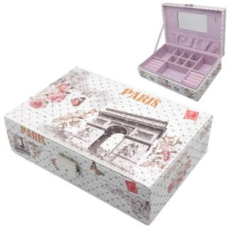 Шкатулка для украшений выполнена в виде чемоданчика 24*16*7 см из искусственной кожи с текстурным декоративным тиснением и великолепным рисунком. Шкатулка одноярусная, состоит из множества отсеков для разделения украшений по видам и коллекциям, включая два отсека с валиками для колец. Внутренняя сторона крышки оборудована зеркалом, кармашком по всей ширине крышки и двумя крючками. Чемоданчик закрывается с помощью замка. Внутренняя поверхность шкатулки оформлена светлым флоком, что придаёт ей шарм и изысканность.