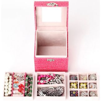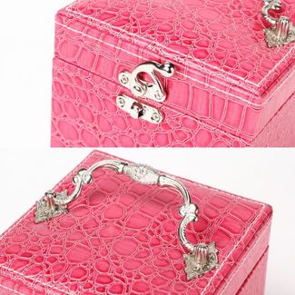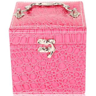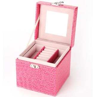 Квадратная шкатулка для украшений размером 12*12*12 см выполнена из розовой лаковой искусственной кожи с декоративным тиснением под кожу рептилии. Шкатулка "Ангелина" трёхъярусная, все три уровня последовательно вынимаются и могут быть расположены в произвольном порядке. Одно съёмное отделение содержит два боковых отсека для украшений, разделённых посередине отсеком с валиками для колец. Второе съёмное отделение состоит из двух отсеков, третье - из девяти. Внутренняя сторона крышки оборудована квадратным зеркальцем 7*7 см. Шкатулка закрывается на замок-крючок и имеет удобную складывающуюся ручку-переноску. Внутренняя поверхность шкатулки оформлена светлым флоком, что придаёт ей шарм и изысканность.