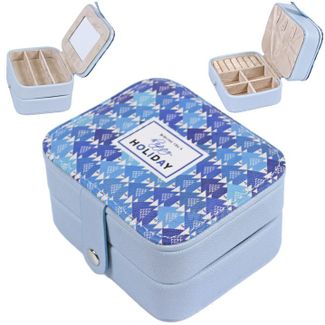 Шкатулка для украшений размером 11*9*6 см двухъярусная и выполнена из искусственной кожи. Нижнее отделение содержит пять отсеков для украшений, включая отсек с валиками для колец. Там же расположены крючки для цепочек и браслетов. Верхнее отделение разделено на три отсека. Внутренняя сторона крышки оборудована зеркальцем. Внутренняя поверхность шкатулки оформлена светлым флоком, что придаёт ей шарм и изысканность.