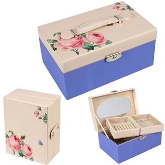 Шкатулка для украшений выполнена в виде чемоданчика 24*16*12 см из искусственной кожи с очень интересным дизайном. Шкатулка двухъярусная, верхний съёмный ярус состоит из отделений различных форм и размеров, включая отсек с валиками для колец, для разделения украшений по видам и коллекциям. Большим преимуществом этой шкатулки является то, что верхний ярус является клатчем и легко превращается в небольшую шкатулочку для украшений дорожного размера, на поверхность которой также нанесён рисунок, по стилю и дизайну совпадающий с тематикой основной шкатулки. Под съёмной частью располагается нижняя область для хранения более крупных украшений. Внутренняя сторона крышки оборудована зеркалом. Чемоданчик закрывается с помощью замка. Внутренняя поверхность шкатулки оформлена мягким флоком, что придаёт ей шарм и изысканность.