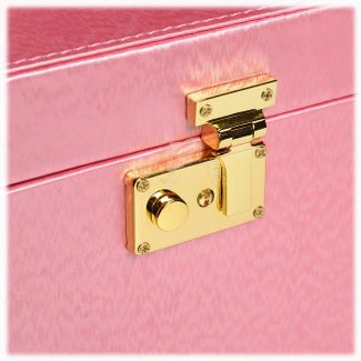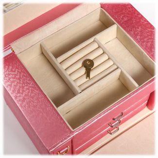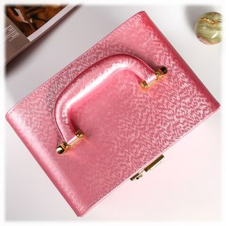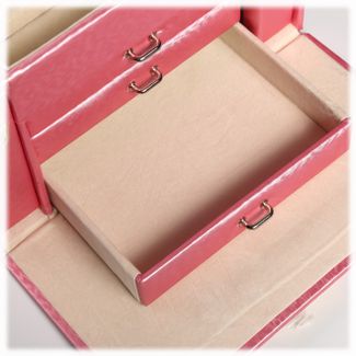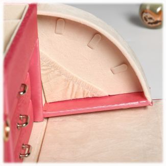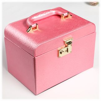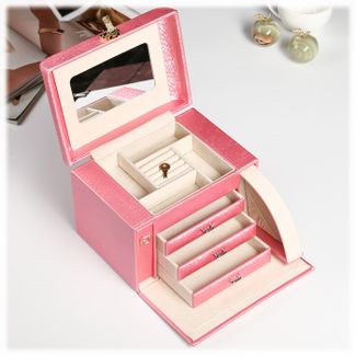 Шкатулка для украшений выполнена в виде сундучка 22*16*16 см из розовой искусственной кожи. "Белла" - вместительная четырёхъярусная шкатулка. В верхнем ярусе расположены отделения, среди которых отсеки с валиками для колец и прочих небольших украшений, каждое из которых требует собственного пространства. Второй, третий и четвёртый ярусы представляют собой выдвижные ящики для цепочек и браслетов. Внутренняя сторона крышки шкатулки "Белла" оборудована зеркалом 14*8 см. Шкатулка закрывается на замок-защёлку с ключиком и имеет удобную ручку-переноску. Боковые стенки шкатулки выдвигаются с обеих стороны, на них с внутренней стороны размещены крепления и кармашек для цепочек и подвесок - очень удобное место, чтобы повесить украшения и избежать их спутывания. Внутренняя поверхность шкатулки оформлена искусственной светлой замшей, что придаёт ей шарм и изысканность.