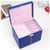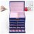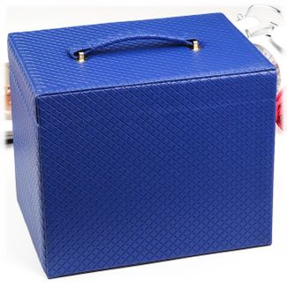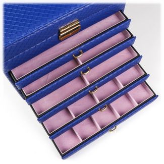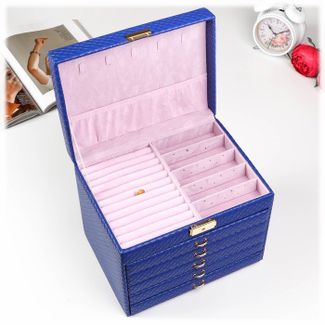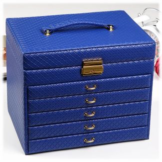 Шкатулка для украшений выполнена в виде сундучка 26*22*19 см из синей текстурной экокожи. Шкатулка "Джанис" шестиярусная. Нижний выдвижной ярус включает 15 отсеков и прекрасно подойдёт для разделения небольших украшений по коллекциям. Выше находится ярус с 12 отделениями, а над ним - ярус с четырьми отделениями. Для более крупных украшений прекрасно подойдут два яруса, расположенные ещё выше, одно из которых раздлено на 2 отсека, а другой имеет один единый отсек. Все выдвижные ярусы вынимаются, и их можно менять местами. Верхний фиксированный ярус состоит из двух отсеков, включая  достаточно широкое отделение с валиками для колец и отделение для серёжек. Внутренняя сторона крышки оборудована кармашком и петлями для размещения цепочек и браслетов. Шкатулка закрывается на замок-защёлку и имеет удобную ручку-переноску. В комплекте идёт ключик, позволяющий закрыть шкатулку в случае необходимости. Внутренняя поверхность шкатулки оформлена искусственной светлой замшей, что придаёт ей шарм и изысканность.